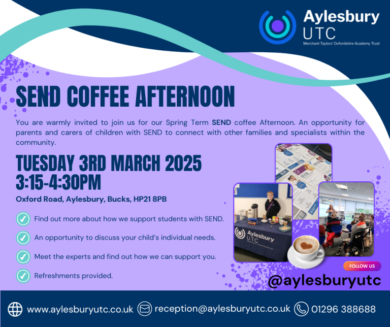 Home Events - Aylesbury UTC Event Key Date SEND Coffee Morning SEND Coffee Morning Click the link for full details. + Add to Google Calendar + iCal / Outlook export Date 03 Mar 2026 Time 3:15 pm - 4:30 pm Category Event Key Date